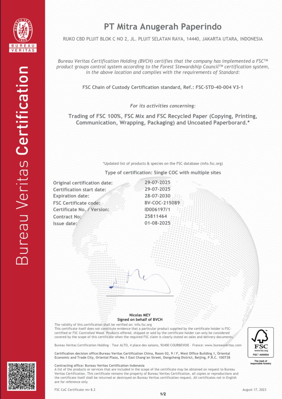 And the achievement at this time we have obtained the FSC certificate. Which FSC is an organization that ensures the standard of sustainable forest management that is trusted in the world. Therefore we are proud to be part of this organization. Let’go green..
